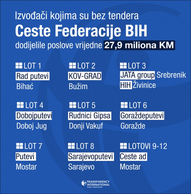 Čim se jedan od ponuđača žalio Ceste FBiH našle su se u situaciji da ne mogu vršiti redovno održavanje svih magistralnih puteva u svojoj nadležnosti. Zato su se obratili Vladi Federacije BIH i dobili odobrenje da “prekrše zakon” tačnije da bez ikakvog postupka sklope anekse ugovora sa postojećim izvođačima, što je na kraju plaćeno 27,9 miliona maraka. Transparency interantional u BiH pratio je ovaj postupak iz kojeg se vidi da su uslovi bili diskriminatorni i da se ovakav ishod mogao očekivati.