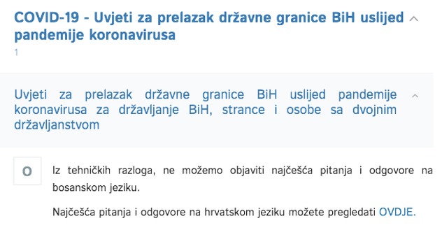 U kategoriji COVID-19 – Uvjeti za prelazak državne granice BiH usljed pandemije koronavirusa nema odgovora na bosanskom jeziku, a razlog toga su, kako navode, tehnički razlozi.